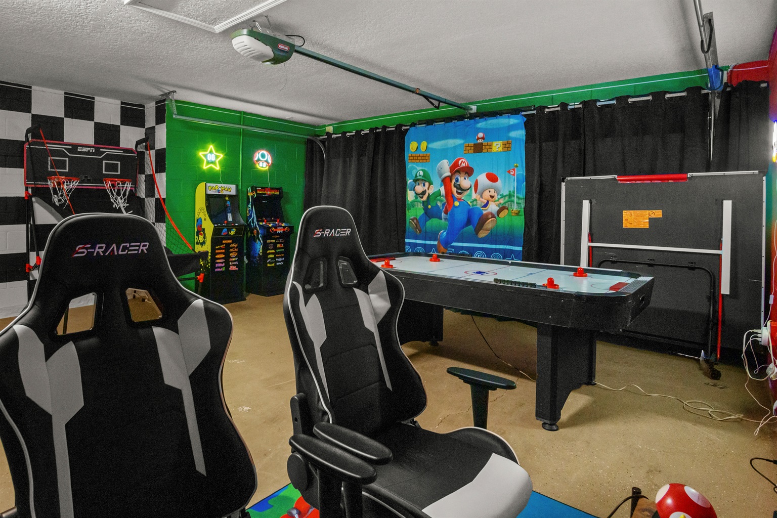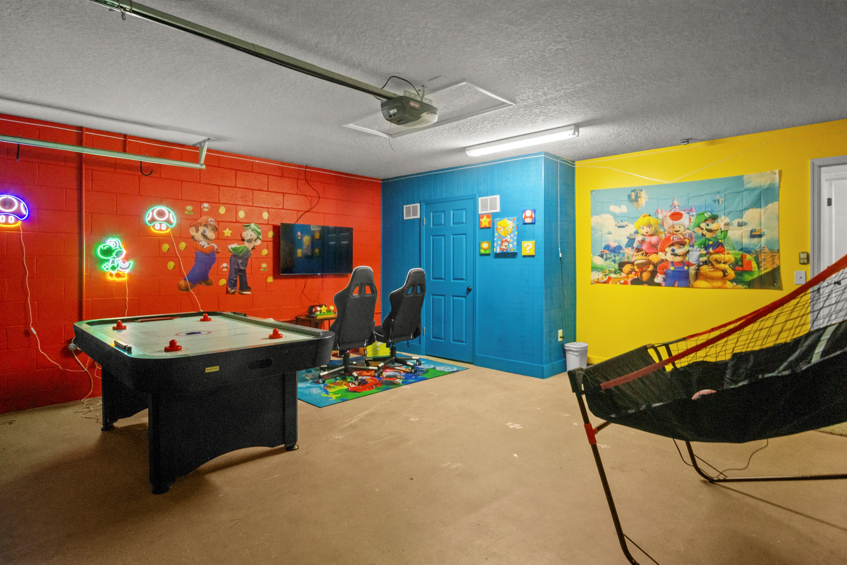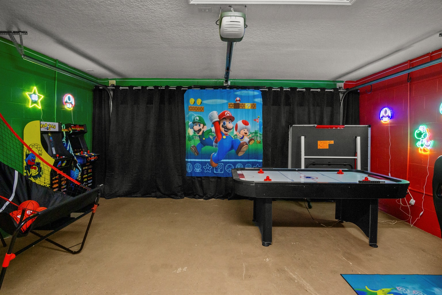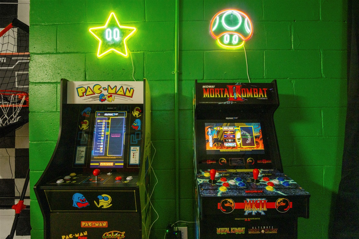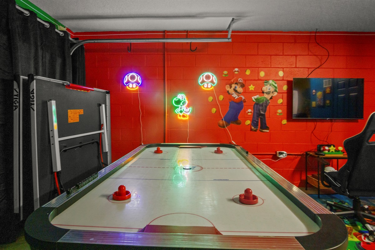 The home also includes a fully equipped game room, perfect for guests of all ages. Enjoy a Nintendo Switch 2 with two controllers and three games, an air hockey table, ping pong table, basketball goal game, and two stand-up arcade video games—a great way to unwind after a day at the parks.