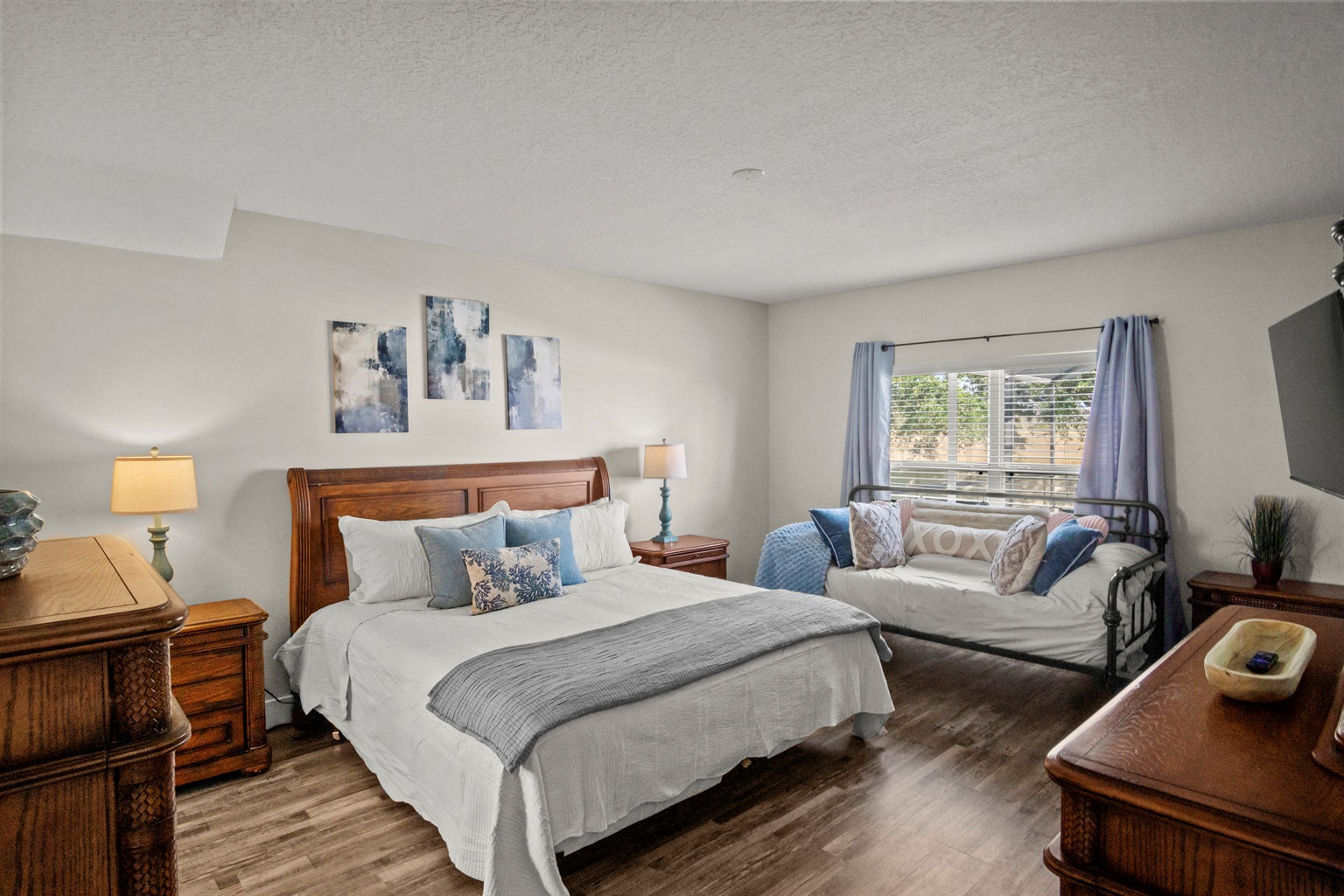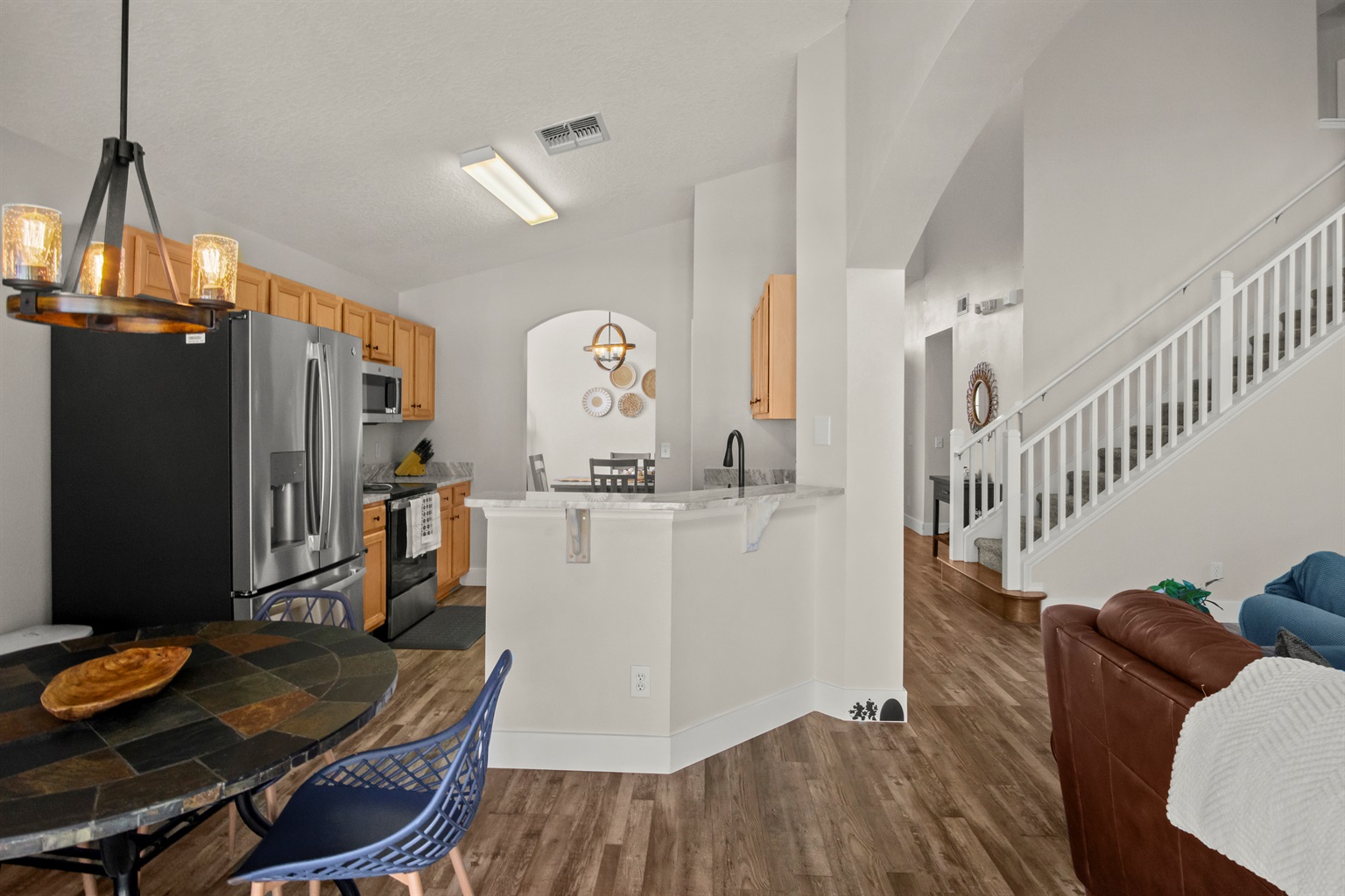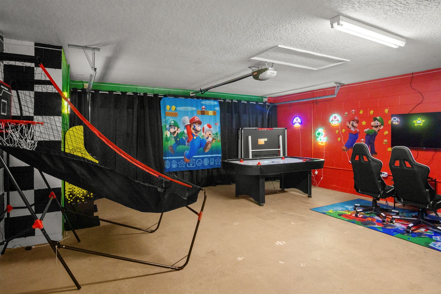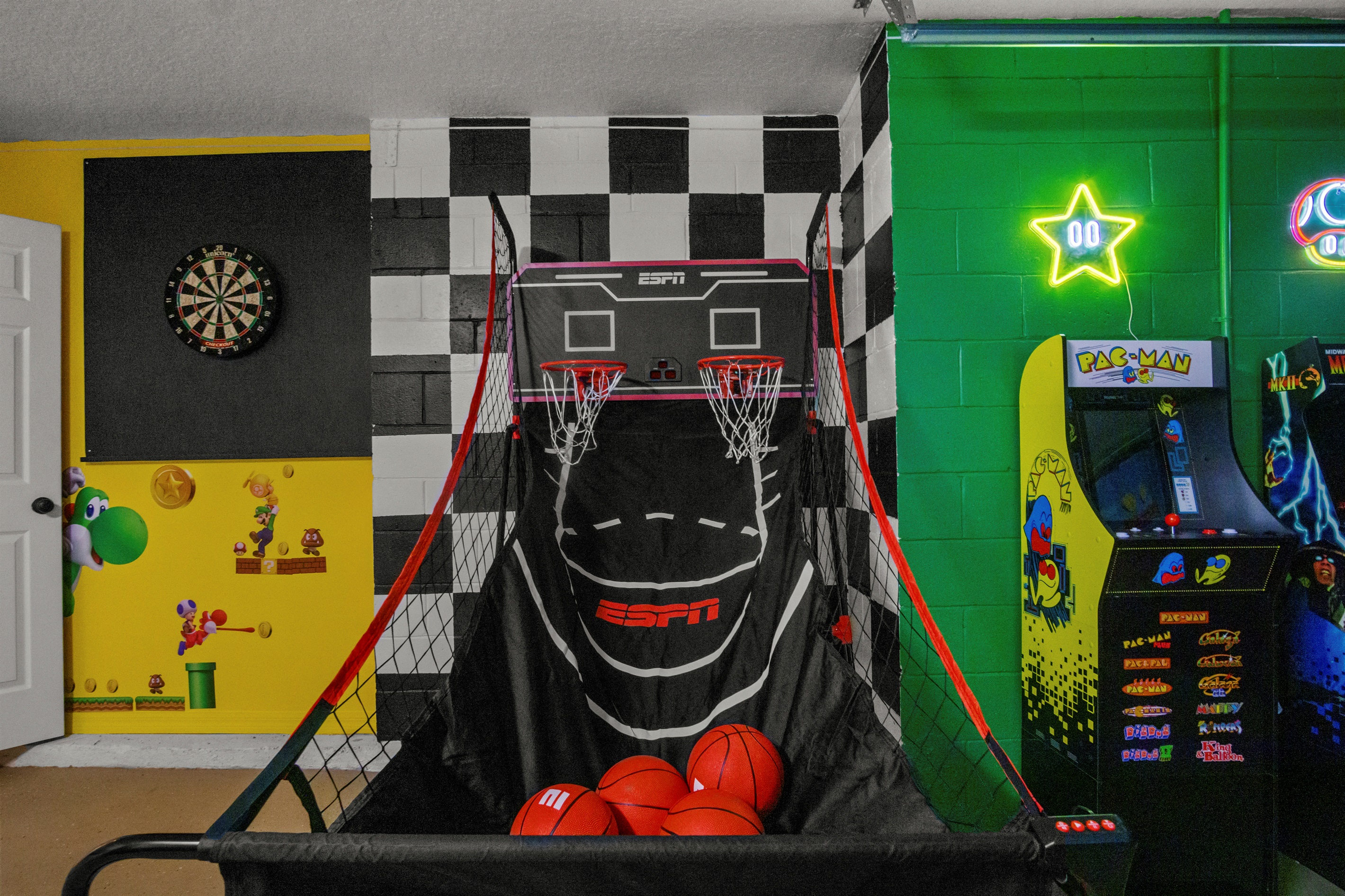 The home also includes a fully equipped game room, perfect for guests of all ages. Enjoy a Nintendo Switch 2 with two controllers and three games, an air hockey table, ping pong table, basketball goal game, and two stand-up arcade video games—a great way to unwind after a day at the parks.