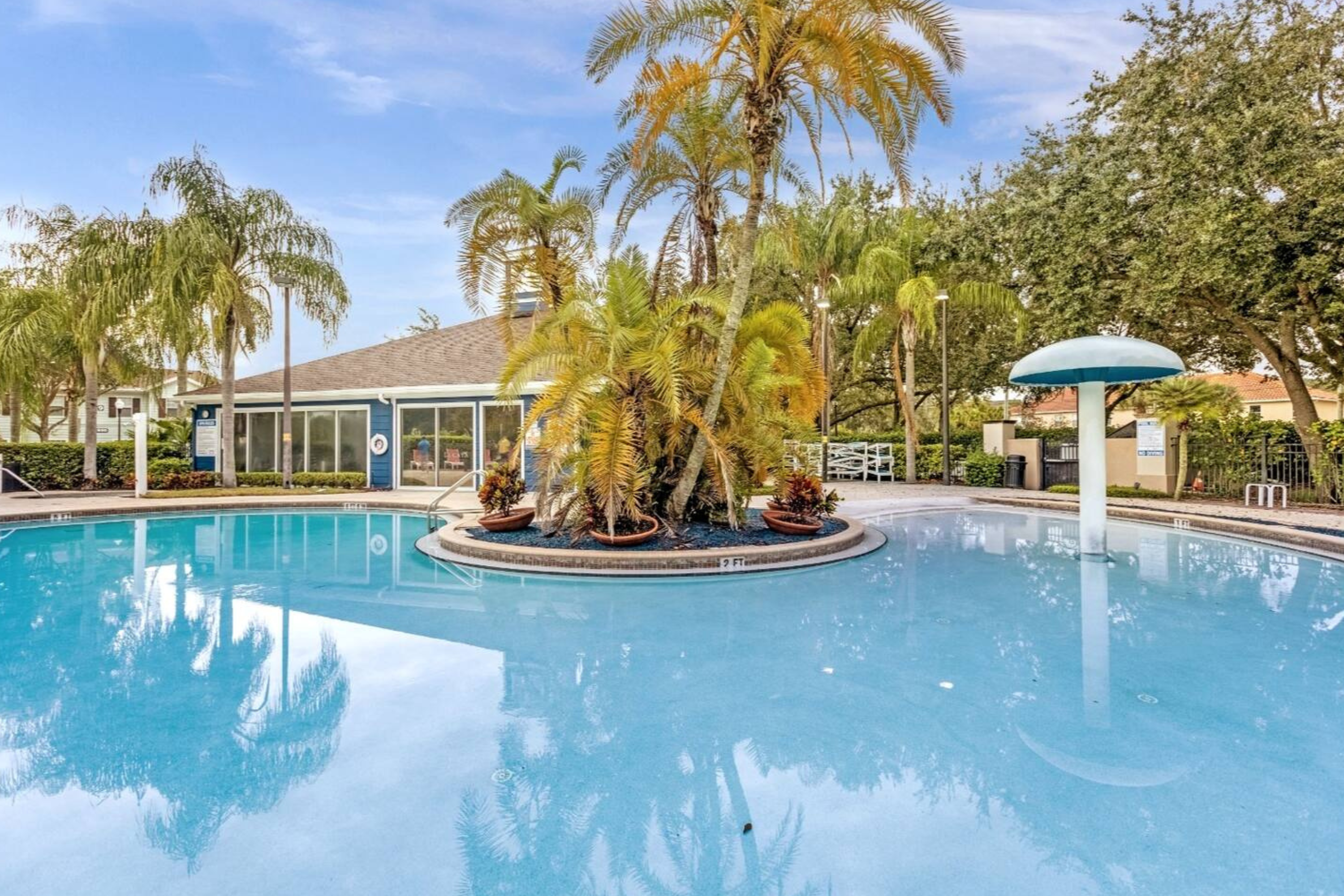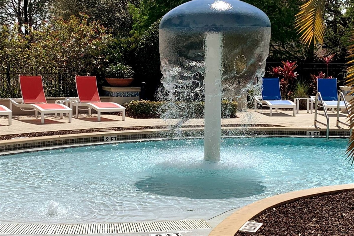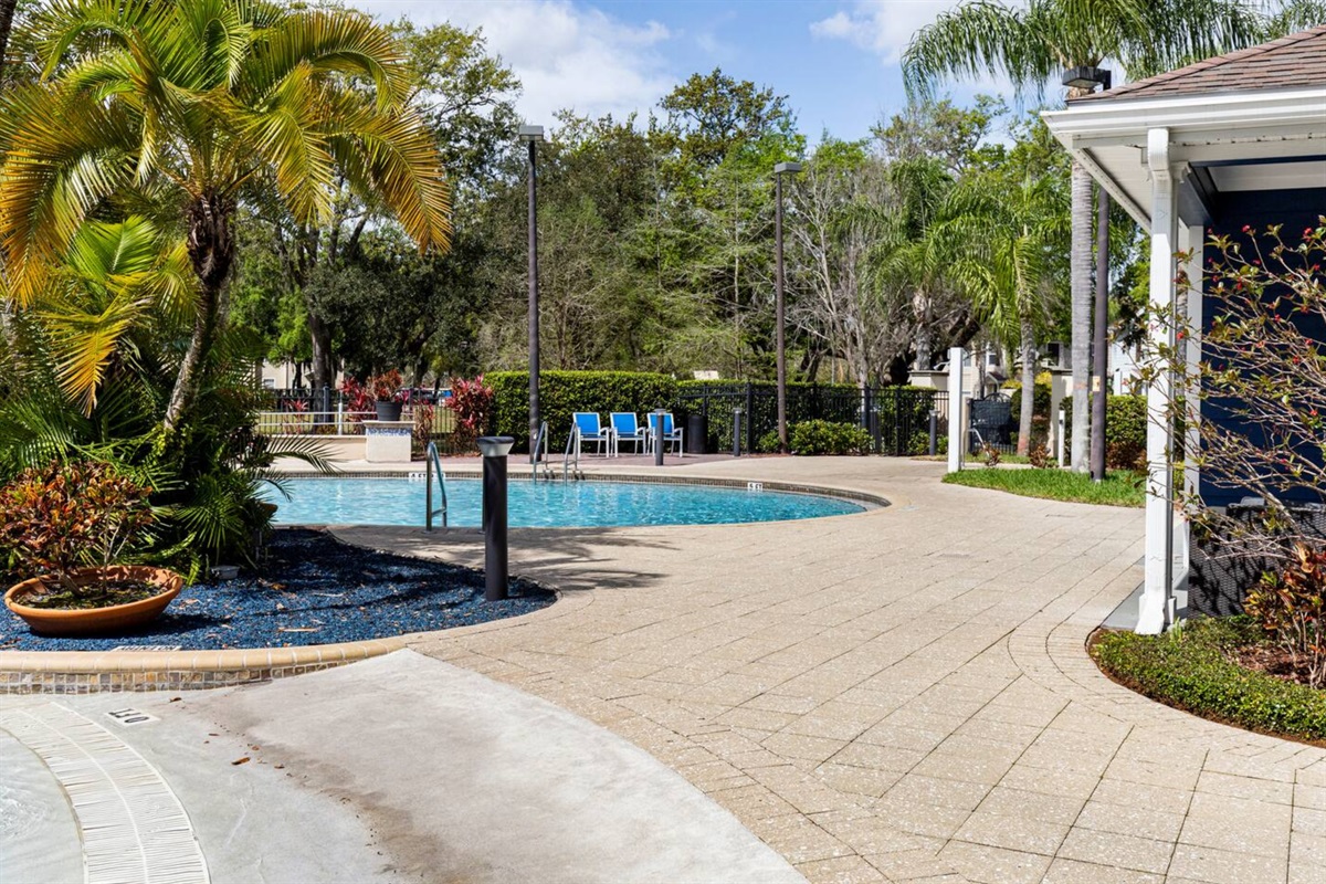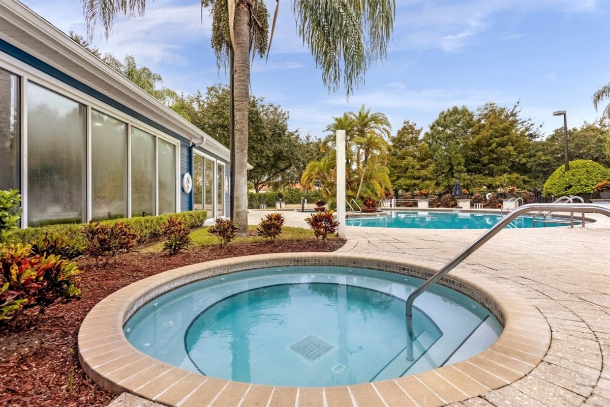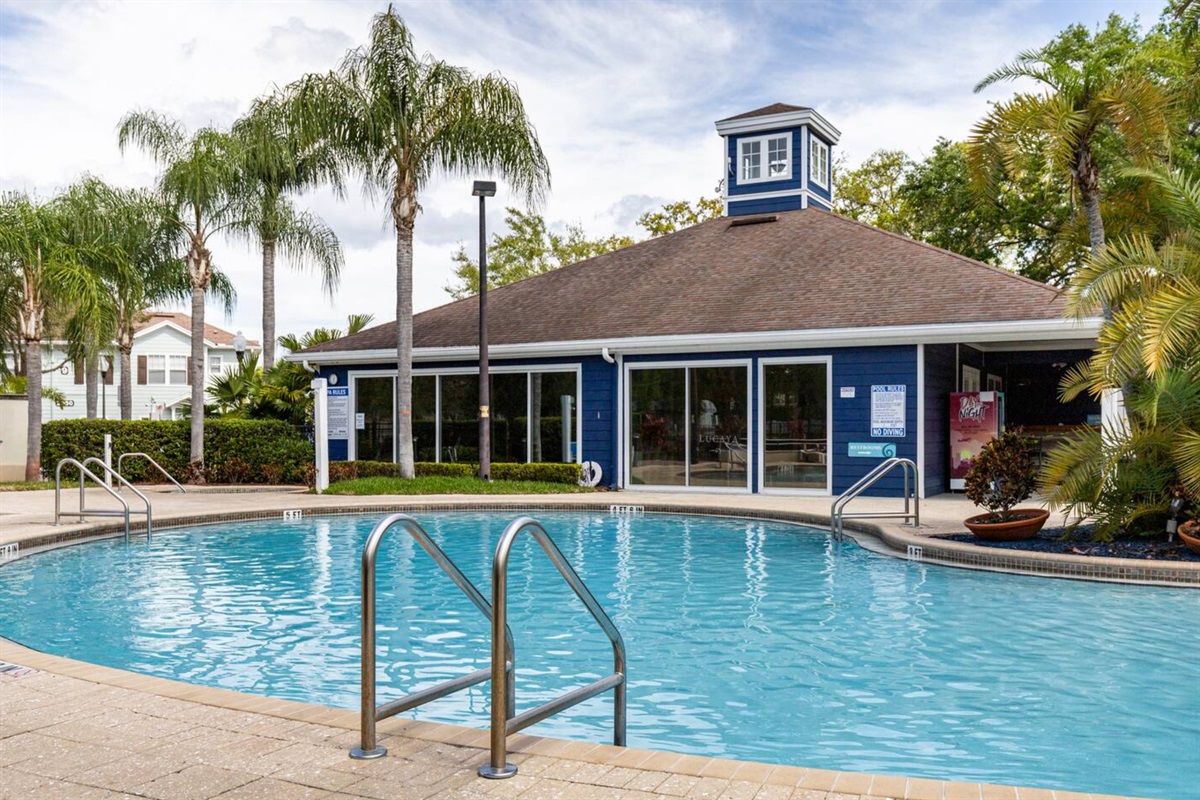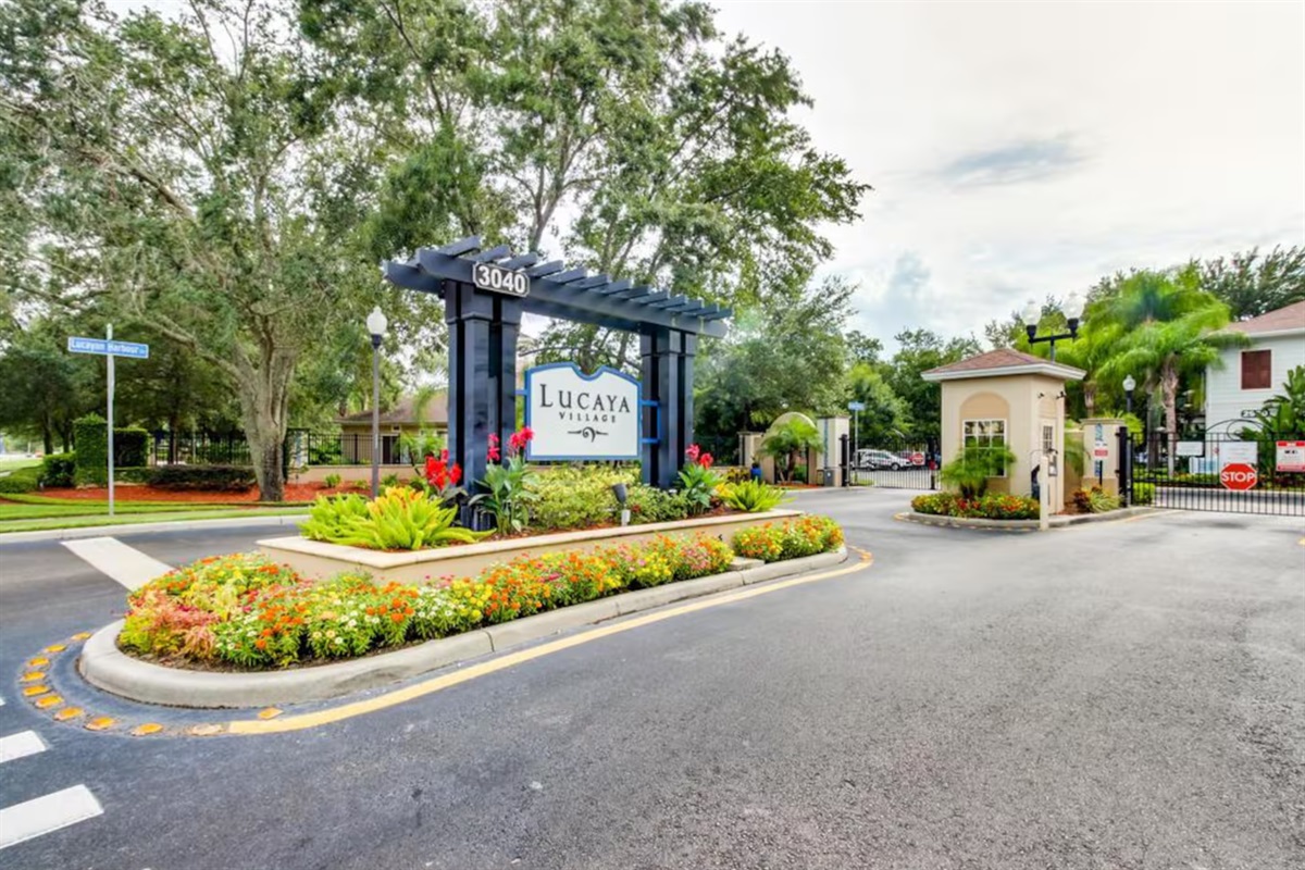 Guests have access to Lucaya Village resort amenities, which include a resort-style swimming pool, hot tub/spa, clubhouse, fitness center, business center, and outdoor seating and lounge areas. The gated setting offers a quiet and secure environment while remaining close to shopping, dining, and major Orlando attractions.