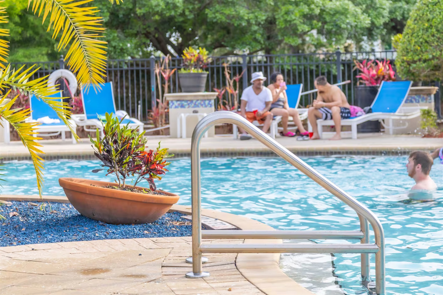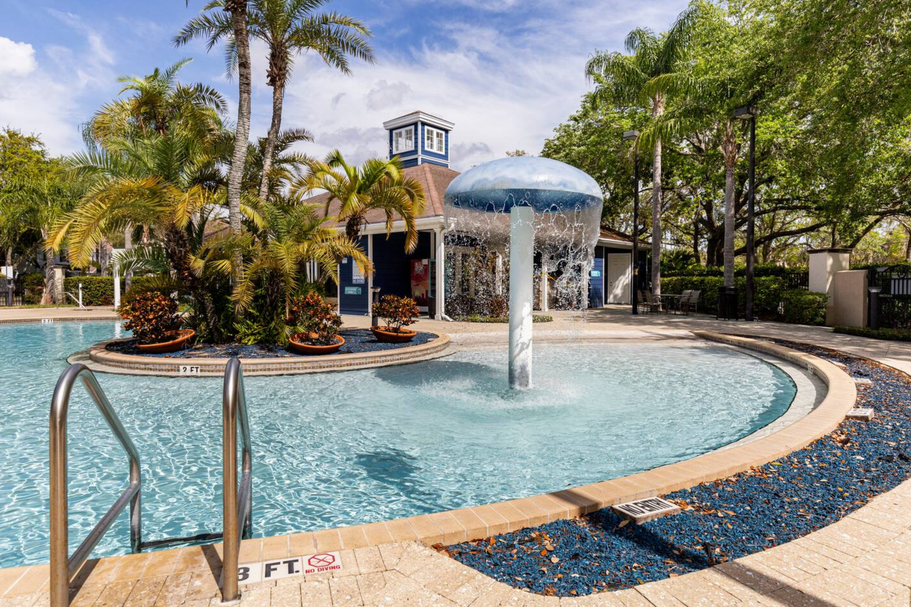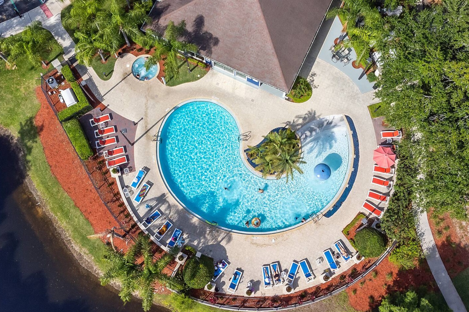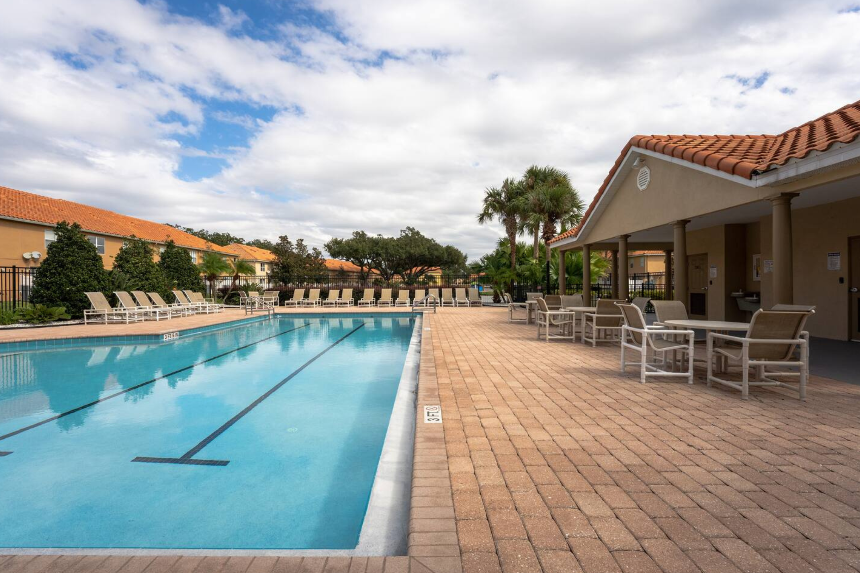 Guests have access to Lucaya Village resort amenities, which include a resort-style swimming pool, hot tub/spa, clubhouse, fitness center, business center, and outdoor seating and lounge areas. The gated setting offers a quiet and secure environment while remaining close to shopping, dining, and major Orlando attractions.