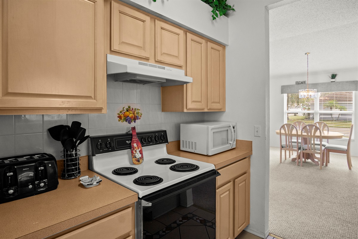 • Fully Equipped Kitchen: Stainless-steel appliances, large island, cookware, utensils, and everything needed for home-cooked meals.
